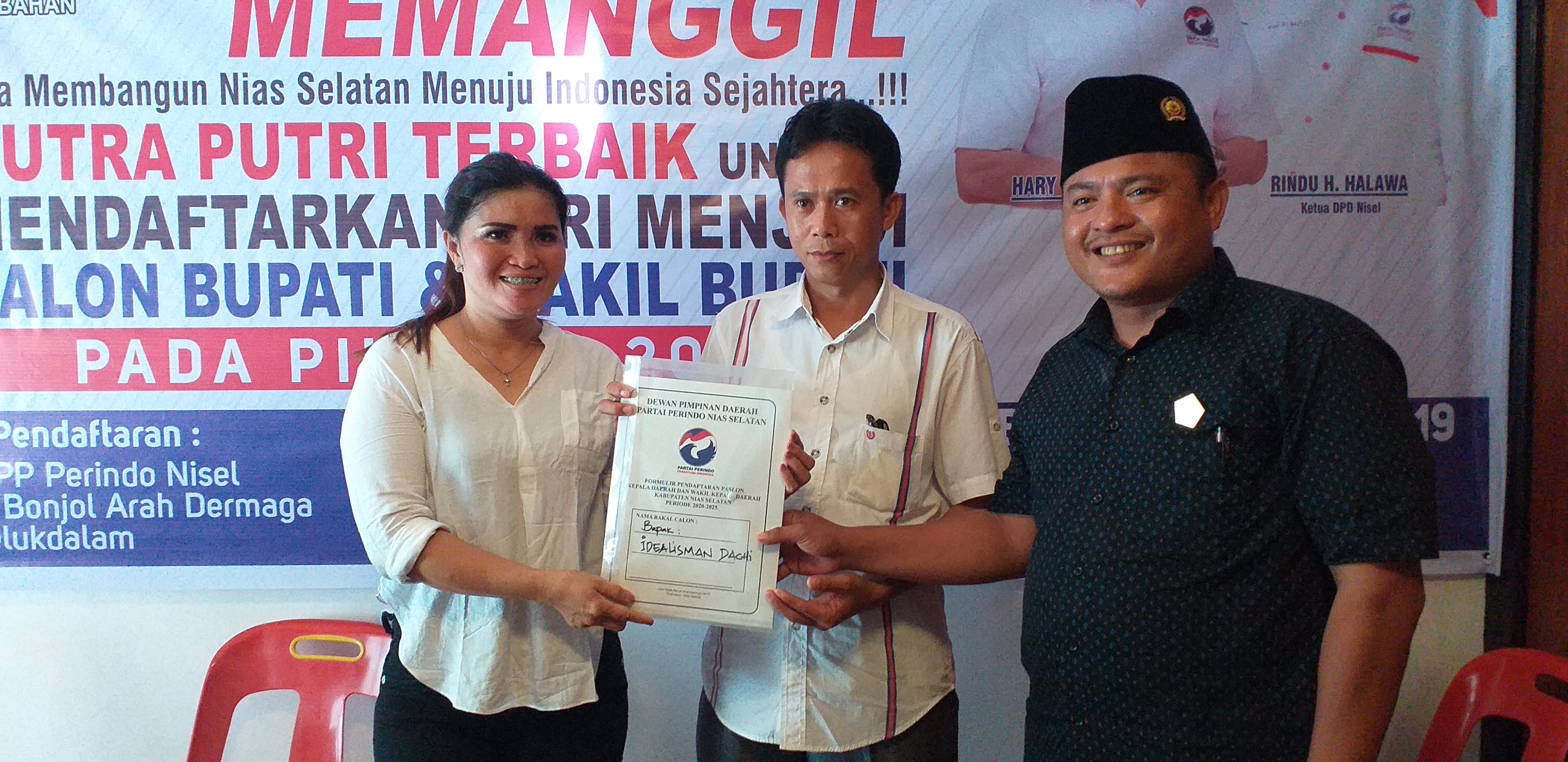Nias Selatan, Deliknews – Idealisman Dachi yang di wakili oleh Juni Ardin Tafonao dan Alternatif Bago Mengambil Formulir Pendaftaran Bakal Calon Bupati Nias Selatan pada Pemilu serentak Tahun 2020, di Sekretariat Tim Penjaringan Partai Perindo Kabupaten Nias Selatan, Kamis (10/10/2019) jalan Imam Bonjol Kelurahan Pasar Telukdalam Nias Selatan.