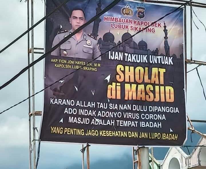 Pasaman, – Imbauan Kapolres Lubuk Sikaping Akp. Fion Joni Hayes melalui spanduk yang dipasang agar jangan takut sholat di Masjid mendapat pujian dari publik termasuk masyarakat setempat, sebab ia meminta warga untuk tetap beribadah, karena masjid memang tempat ibadah, namun harus menjaga kesehatan.
