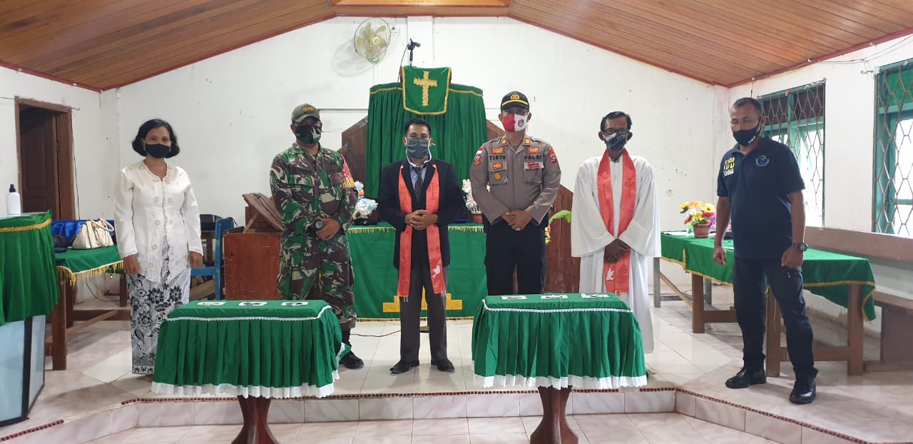 Sosialisasi yang dilakukan Kapolsek Sikakap AKP Tirto Edhi seperti pada masyarakat jemaat Gereja Km 7 GKPM Bukit Moria Dusun Bosua Giru dan Gereja GKPM Paranata Desa Seaybaru Kecamatan Sikakap Kabupaten Kepulauan Mentawai, Minggu, (19/07/20).