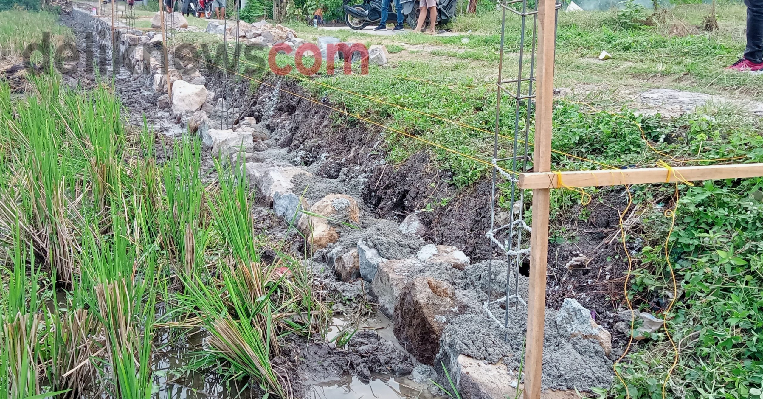 ” Memang di kontruksi bangunan/RAB gak ada pondosi mas karena tekstur tanah bercampur cadas(batuan padas) yang keras,sehingga bangunan TPT ini tanpa Pondasi juga sudah kuat.” Imbuhnya