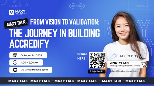 MAXY Academy kembali menggelar acara talkshow mingguan bertajuk Maxy Talk dengan tema “From Vision to Validation: The Journey in Building Accredify” yang dilaksanakan pada Kamis, 3 Oktober 2024. Acara ini mengundang Jing Yi, COO dari Accredify, untuk membagikan kisah dan pengalamannya membangun Accredify sejak tahun 2020. Dalam sesi ini, Jing Yi memberikan wawasan yang mendalam tentang perjalanan perusahaannya dalam membangun solusi inovatif di sektor teknologi digital.