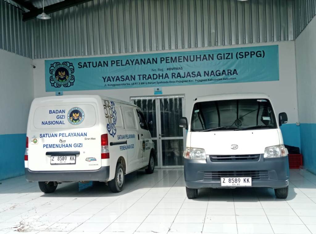 Dua mobil nampak gagah terparkir di teras Satuan Pelayanan Pemenuhan Gizi (SPPG) Yayasan Tradha Rajasa Nagara di Jl. Ronggowarsito No.13 RT 3 RW 6 Perum Syahzada Desa Pejagoan, Kec. Pejagoan, Kabupaten Kebumen.