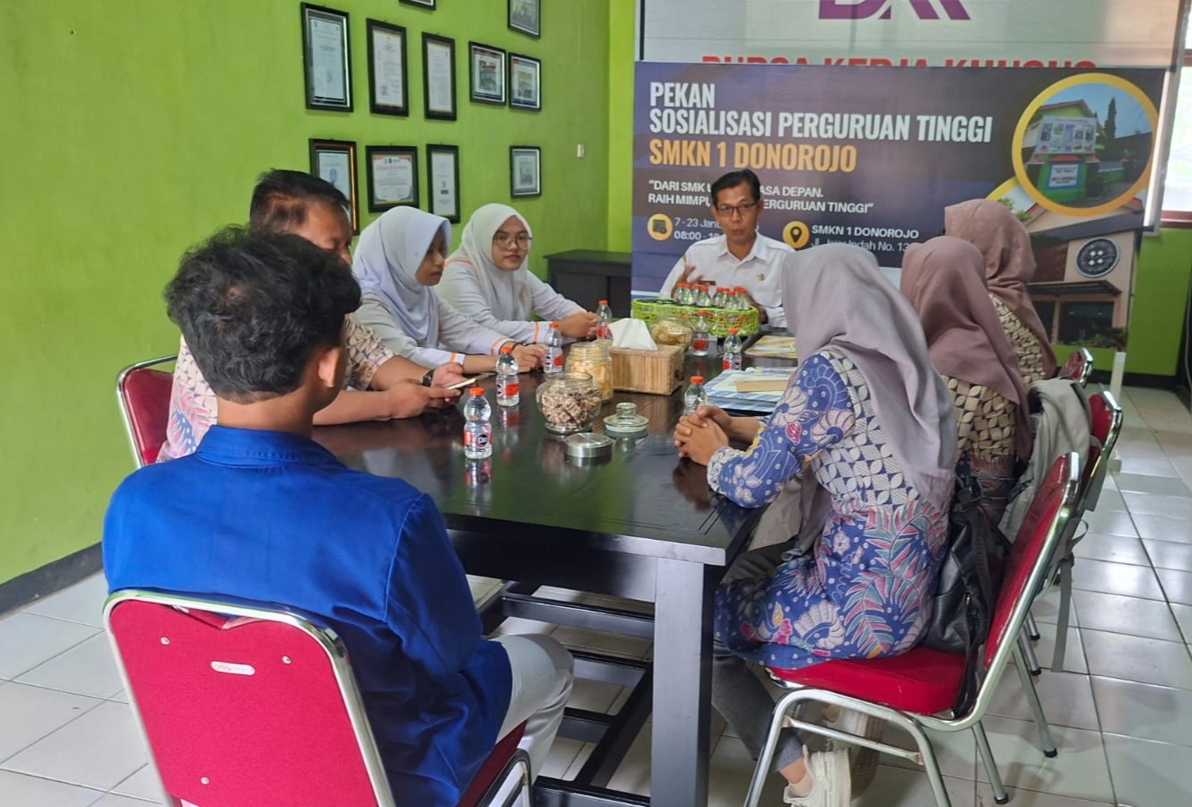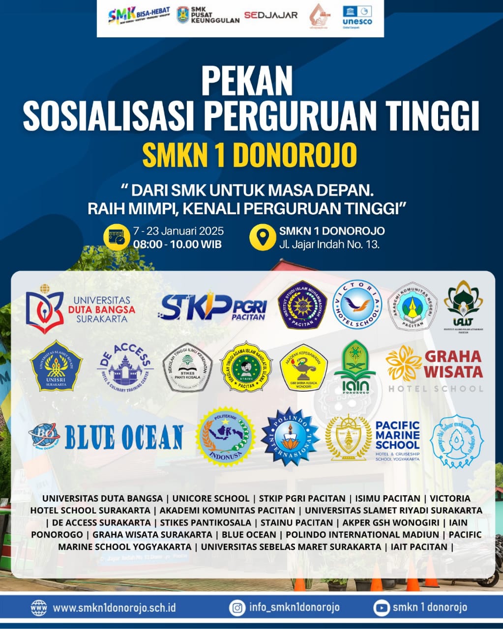 PACITAN,deliknews.com – Dalam upaya membekali para siswa untuk melangkah ke jenjang pendidikan yang lebih tinggi, SMKN 1 Donorojo menyelenggarakan agenda tahunan bertajuk “Pekan Sosialisasi Perguruan Tinggi”. Kegiatan ini berlangsung cukup panjang, mulai tanggal 7 hingga 23 Januari 2025, bertempat di lingkungan SMKN 1 Donorojo.